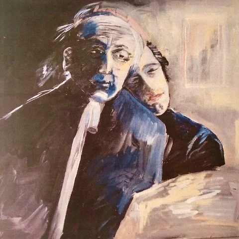 Marianna Magyarovits “Treffen mit Leonard in Montreal”, 2022, 20 x 20 cm, Mischtechnik Transfer